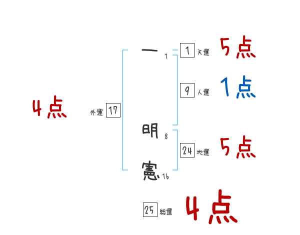 天運![]() | 一明憲さんの天運は1画の5つ星!行動力、指導力があり出世し繁栄する。幸運に恵まれる。 家系が持つ宿命的な運勢を表します。祖先から受け継いだ苗字ですので自分の力が及びません。家柄を象徴します。 |