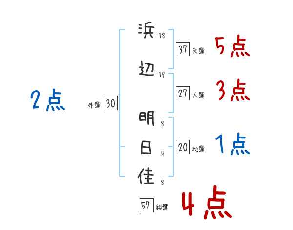 総運![]() | 浜辺明日佳さんの総運は57画の4つ星!向上心があり人望がある。地位を得る。 あなたの人生を表す1番重要な運勢です。生涯を通じて影響する総合運となり、主に50歳以降の晩年期に影響を及ぼします。 |