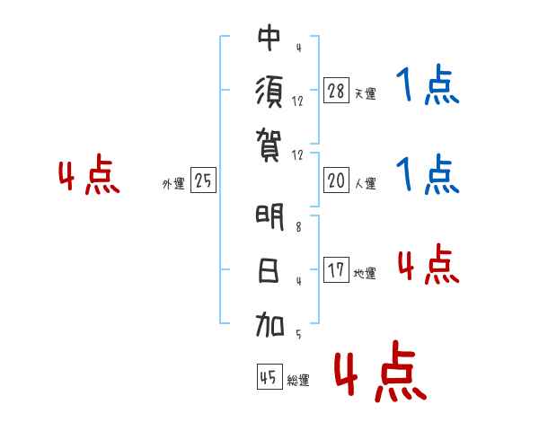 天運![]() | 中須賀明日加さんの天運は28画の1つ星!家庭環境に注意。スポーツで活躍できる能力があるかも。 家系が持つ宿命的な運勢を表します。祖先から受け継いだ苗字ですので自分の力が及びません。家柄を象徴します。 |