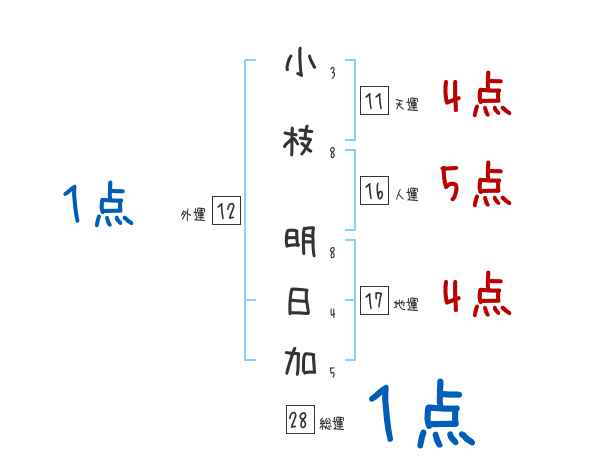 天運![]() | 小枝明日加さんの天運は11画の4つ星!着実に富や地位を得る幸運な人生。 家系が持つ宿命的な運勢を表します。祖先から受け継いだ苗字ですので自分の力が及びません。家柄を象徴します。 |