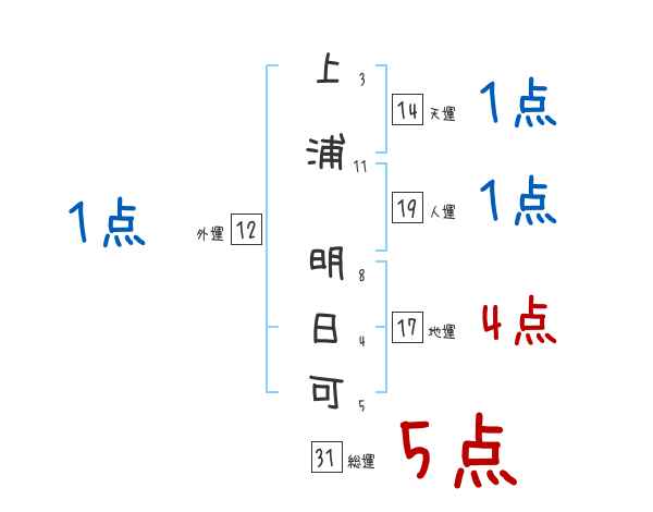 天運![]() | 上浦明日可さんの天運は14画の1つ星!人に対して優しいがストレスを溜め込みがち。人間関係のトラブルを避けるよう気をつけましょう。 家系が持つ宿命的な運勢を表します。祖先から受け継いだ苗字ですので自分の力が及びません。家柄を象徴します。 |