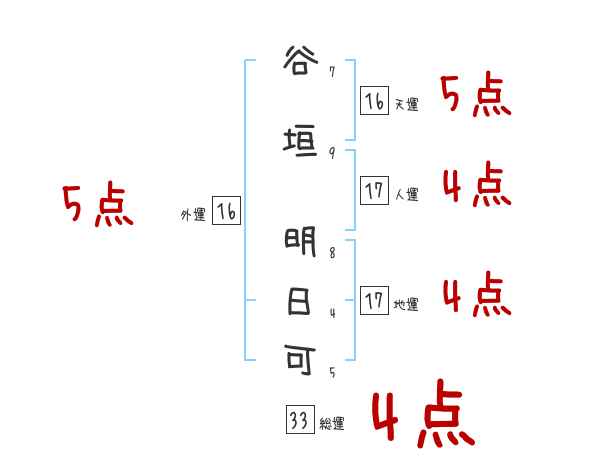 外運![]() | 谷垣明日可さんの外運は16画の5つ星!人望が厚く大きく発展する。逆転成功が見える。 生活面を象徴する運勢です。外部から受ける影響力を表し、結婚運、家庭運や職場、環境への順応性を表します。 |
