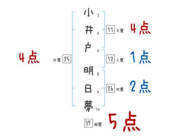 天運![]() | 小井戸明日夢さんの天運は11画の4つ星!着実に富や地位を得る幸運な人生。 家系が持つ宿命的な運勢を表します。祖先から受け継いだ苗字ですので自分の力が及びません。家柄を象徴します。 |
