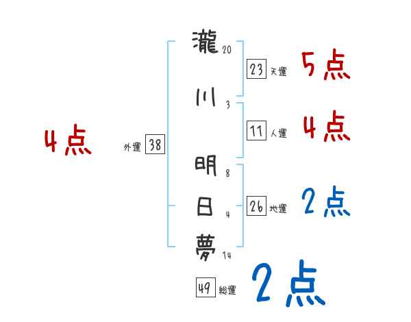 | 天運  | 瀧川明日夢さんの天運は23画の5つ星!想像力に優れ活力がある。一代で成功し名誉を手に入れる。家系が持つ宿命的な運勢を表します。祖先から受け継いだ苗字ですので自分の力が及びません。家柄を象徴します。 |