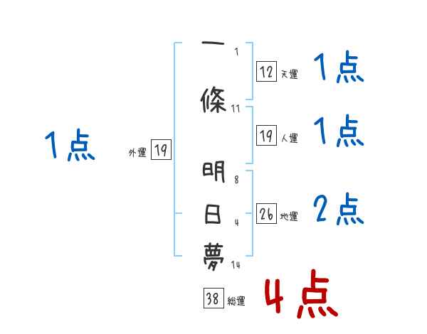 人運![]() | 一條明日夢さんの人運は19画の1つ星!優れた才能を持ちますが、協調性が足りないことも。周りの人と協力する事を意識しましょう。 性格や才能などを表す2番目に重要な運勢です。人間関係や協調性、社会的な成功に影響します。主に20歳から50歳ぐらいまでの中年期の運勢を表します。 |