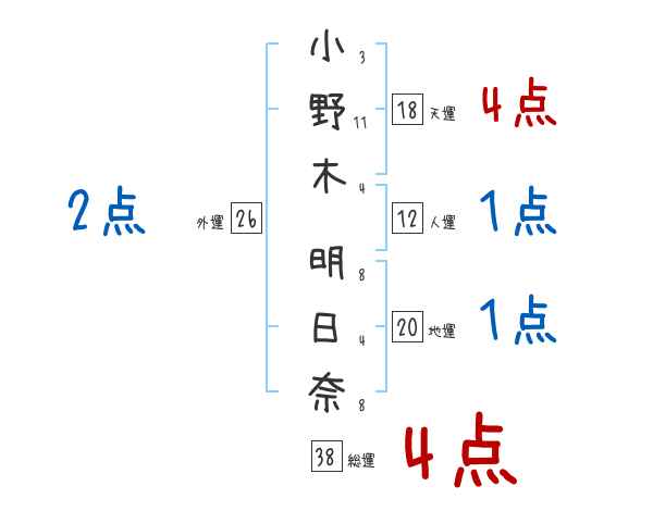 天運![]() | 小野木明日奈さんの天運は18画の4つ星!情熱的で剛気。忍耐力があり信頼される。 家系が持つ宿命的な運勢を表します。祖先から受け継いだ苗字ですので自分の力が及びません。家柄を象徴します。 |