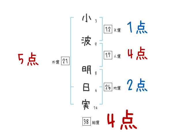外運![]() | 小波明日実さんの外運は21画の5つ星!統率力がある。独立し成功する。名誉を手に入れる。 生活面を象徴する運勢です。外部から受ける影響力を表し、結婚運、家庭運や職場、環境への順応性を表します。 |