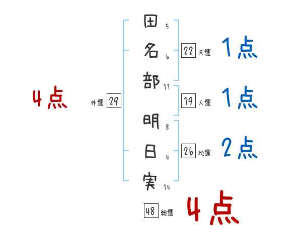 外運![]() | 田名部明日実さんの外運は29画の4つ星!完全主義で才能がある。厳格な心の持ち主。 生活面を象徴する運勢です。外部から受ける影響力を表し、結婚運、家庭運や職場、環境への順応性を表します。 |