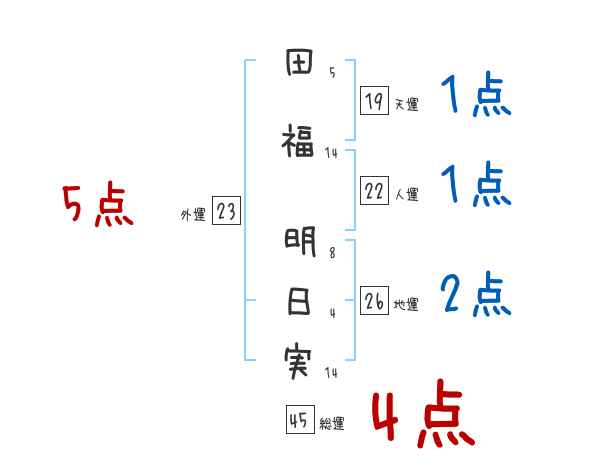 総運![]() | 田福明日実さんの総運は45画の4つ星!もくもくと物事を進め達成する。地味な努力家。 あなたの人生を表す1番重要な運勢です。生涯を通じて影響する総合運となり、主に50歳以降の晩年期に影響を及ぼします。 |