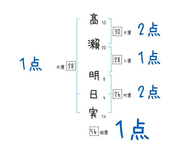 天運![]() | 髙瀨明日実さんの天運は30画の2つ星!浮き沈みの激しさに注意しましょう。 家系が持つ宿命的な運勢を表します。祖先から受け継いだ苗字ですので自分の力が及びません。家柄を象徴します。 |