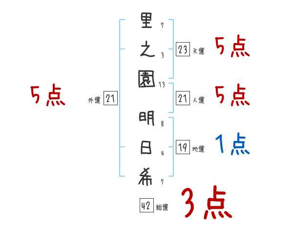 外運![]() | 里之園明日希さんの外運は21画の5つ星!統率力がある。独立し成功する。名誉を手に入れる。 生活面を象徴する運勢です。外部から受ける影響力を表し、結婚運、家庭運や職場、環境への順応性を表します。 |