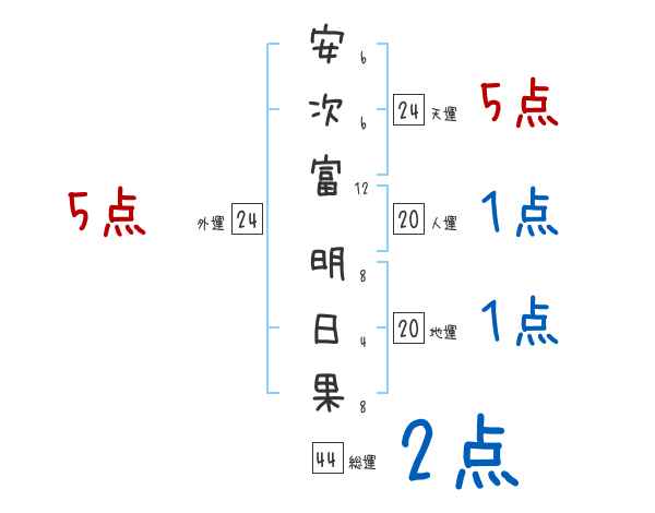 天運![]() | 安次富明日果さんの天運は24画の5つ星!家庭運が良く順調な人生。金運にも恵まれる。 家系が持つ宿命的な運勢を表します。祖先から受け継いだ苗字ですので自分の力が及びません。家柄を象徴します。 |