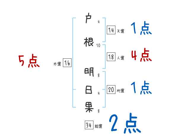 外運![]() | 戸根明日果さんの外運は16画の5つ星!人望が厚く大きく発展する。逆転成功が見える。 生活面を象徴する運勢です。外部から受ける影響力を表し、結婚運、家庭運や職場、環境への順応性を表します。 |