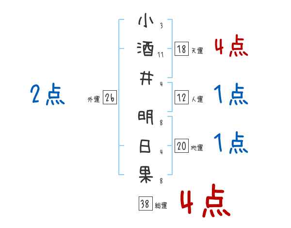 天運![]() | 小酒井明日果さんの天運は18画の4つ星!情熱的で剛気。忍耐力があり信頼される。 家系が持つ宿命的な運勢を表します。祖先から受け継いだ苗字ですので自分の力が及びません。家柄を象徴します。 |