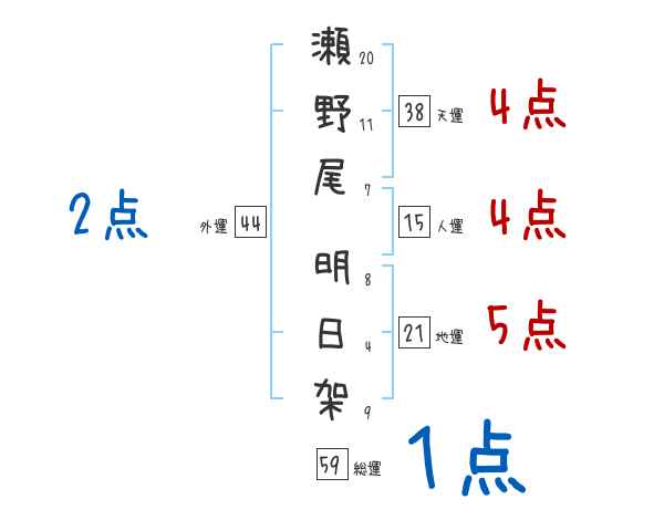 外運![]() | 瀬野尾明日架さんの外運は44画の2つ星!誠実で慎重な性格。物事を考えすぎないように注意しましょう。 生活面を象徴する運勢です。外部から受ける影響力を表し、結婚運、家庭運や職場、環境への順応性を表します。 |
