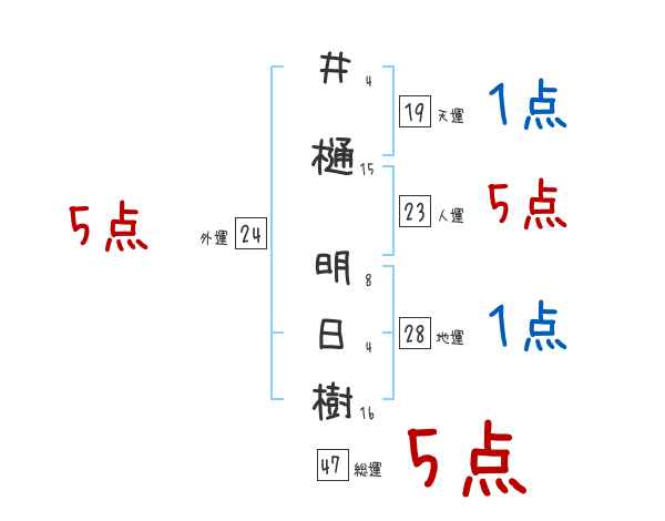 総運![]() | 井樋明日樹さんの総運は47画の5つ星!実力が開花し発展する円満な人生。財に恵まれる。 あなたの人生を表す1番重要な運勢です。生涯を通じて影響する総合運となり、主に50歳以降の晩年期に影響を及ぼします。 |