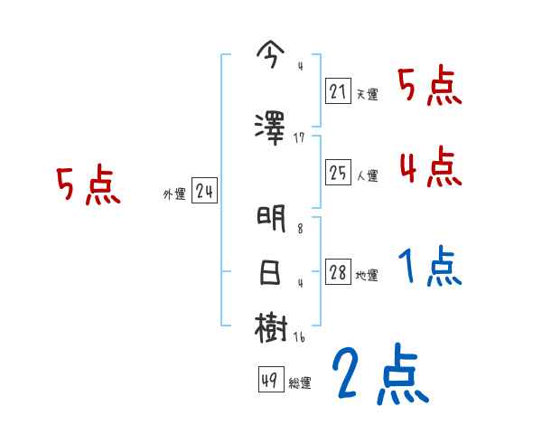 外運![]() | 今澤明日樹さんの外運は24画の5つ星!家庭運が良く順調な人生。金運にも恵まれる。 生活面を象徴する運勢です。外部から受ける影響力を表し、結婚運、家庭運や職場、環境への順応性を表します。 |