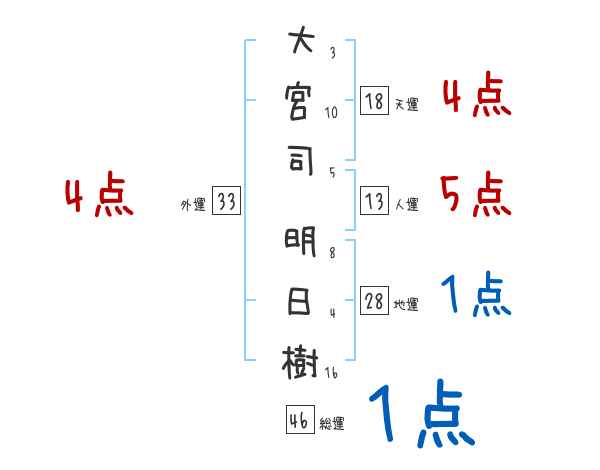 天運![]() | 大宮司明日樹さんの天運は18画の4つ星!情熱的で剛気。忍耐力があり信頼される。 家系が持つ宿命的な運勢を表します。祖先から受け継いだ苗字ですので自分の力が及びません。家柄を象徴します。 |