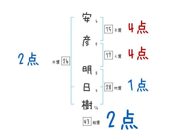 外運![]() | 安彦明日樹さんの外運は26画の2つ星!波瀾万丈かも。信頼できる人を大事にしましょう。 生活面を象徴する運勢です。外部から受ける影響力を表し、結婚運、家庭運や職場、環境への順応性を表します。 |