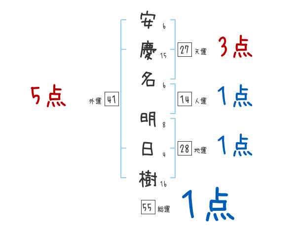 天運![]() | 安慶名明日樹さんの天運は27画の3つ星!頭脳明晰だが強情で摩擦が多い傾向。孤立に注意。 家系が持つ宿命的な運勢を表します。祖先から受け継いだ苗字ですので自分の力が及びません。家柄を象徴します。 |