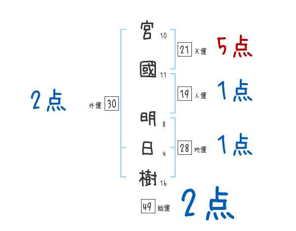 天運![]() | 宮國明日樹さんの天運は21画の5つ星!統率力がある。独立し成功する。名誉を手に入れる。 家系が持つ宿命的な運勢を表します。祖先から受け継いだ苗字ですので自分の力が及びません。家柄を象徴します。 |