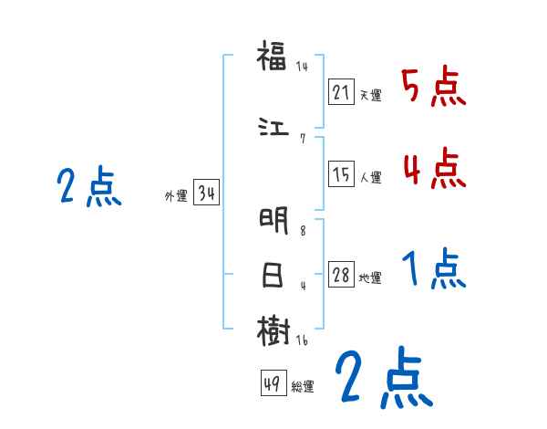 天運![]() | 福江明日樹さんの天運は21画の5つ星!統率力がある。独立し成功する。名誉を手に入れる。 家系が持つ宿命的な運勢を表します。祖先から受け継いだ苗字ですので自分の力が及びません。家柄を象徴します。 |