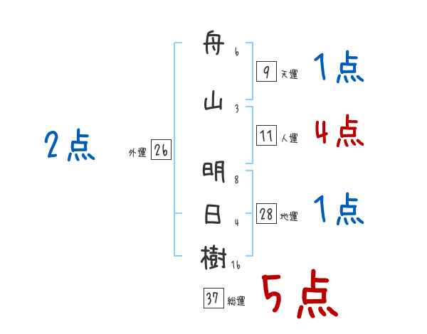 | 地運  | 舟山明日樹さんの地運は28画の1つ星!家庭環境に注意。スポーツで活躍できる能力があるかも。個性を表す基礎的な運勢です。性格形成や対人関係、行動力など家庭環境に影響されます。主に誕生してから20歳くらいまでの若年期の運勢を表します。 |