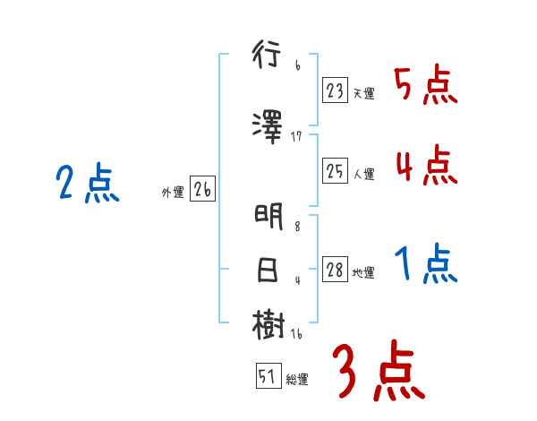 天運![]() | 行澤明日樹さんの天運は23画の5つ星!想像力に優れ活力がある。一代で成功し名誉を手に入れる。 家系が持つ宿命的な運勢を表します。祖先から受け継いだ苗字ですので自分の力が及びません。家柄を象徴します。 |