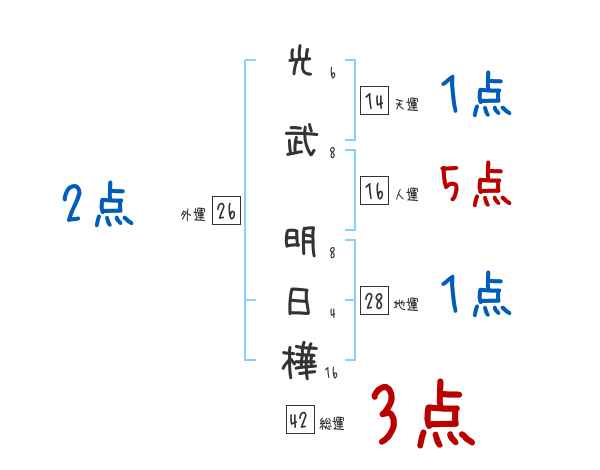 人運![]() | 光武明日樺さんの人運は16画の5つ星!人望が厚く大きく発展する。逆転成功が見える。 性格や才能などを表す2番目に重要な運勢です。人間関係や協調性、社会的な成功に影響します。主に20歳から50歳ぐらいまでの中年期の運勢を表します。 |