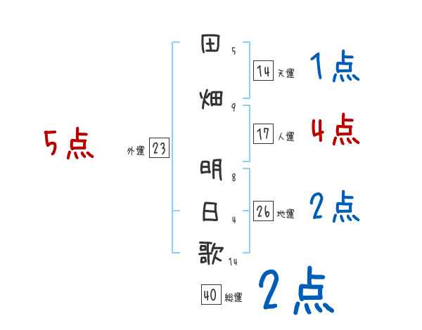 天運![]() | 田畑明日歌さんの天運は14画の1つ星!人に対して優しいがストレスを溜め込みがち。人間関係のトラブルを避けるよう気をつけましょう。 家系が持つ宿命的な運勢を表します。祖先から受け継いだ苗字ですので自分の力が及びません。家柄を象徴します。 |