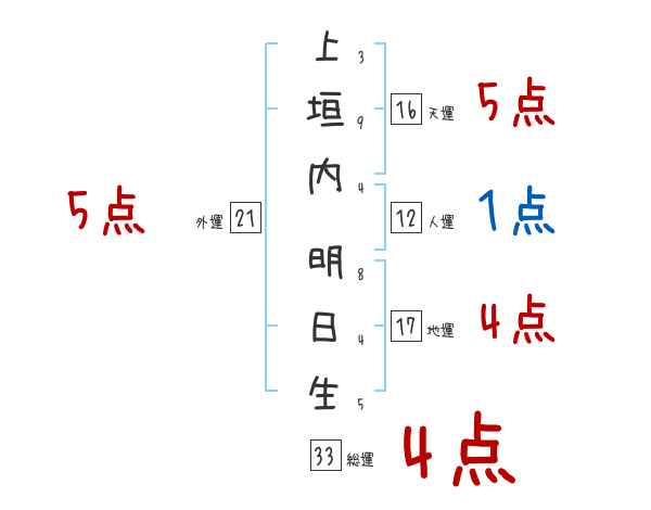 外運![]() | 上垣内明日生さんの外運は21画の5つ星!統率力がある。独立し成功する。名誉を手に入れる。 生活面を象徴する運勢です。外部から受ける影響力を表し、結婚運、家庭運や職場、環境への順応性を表します。 |