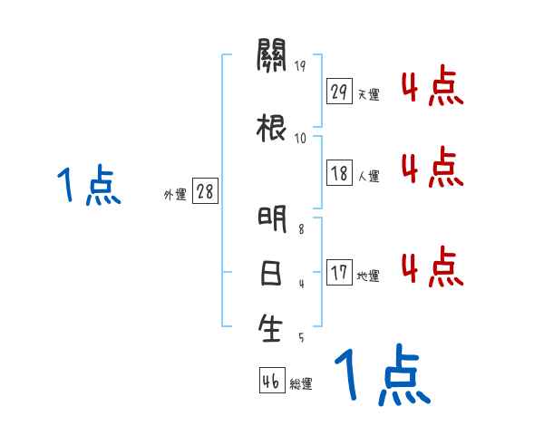 外運![]() | 關根明日生さんの外運は28画の1つ星!家庭環境に注意。スポーツで活躍できる能力があるかも。 生活面を象徴する運勢です。外部から受ける影響力を表し、結婚運、家庭運や職場、環境への順応性を表します。 |