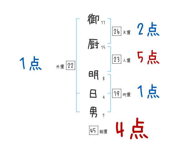 天運![]() | 御厨明日男さんの天運は26画の2つ星!波瀾万丈かも。信頼できる人を大事にしましょう。 家系が持つ宿命的な運勢を表します。祖先から受け継いだ苗字ですので自分の力が及びません。家柄を象徴します。 |