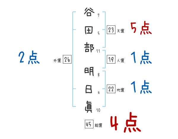 総運![]() | 谷田部明日眞さんの総運は45画の4つ星!もくもくと物事を進め達成する。地味な努力家。 あなたの人生を表す1番重要な運勢です。生涯を通じて影響する総合運となり、主に50歳以降の晩年期に影響を及ぼします。 |