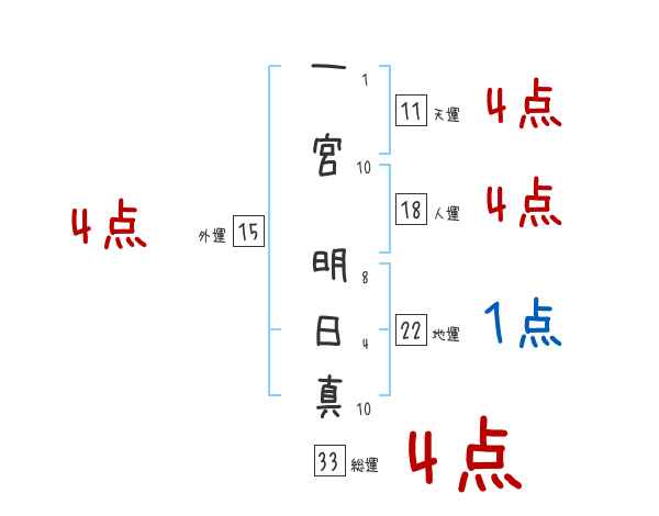天運![]() | 一宮明日真さんの天運は11画の4つ星!着実に富や地位を得る幸運な人生。 家系が持つ宿命的な運勢を表します。祖先から受け継いだ苗字ですので自分の力が及びません。家柄を象徴します。 |