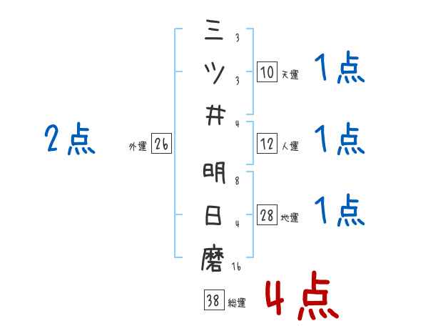 総運![]() | 三ツ井明日磨さんの総運は38画の4つ星!温厚な性格で技術的な才能を発揮する。職人的な仕事に向いている。 あなたの人生を表す1番重要な運勢です。生涯を通じて影響する総合運となり、主に50歳以降の晩年期に影響を及ぼします。 |