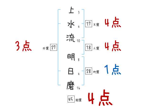 外運![]() | 上水流明日磨さんの外運は27画の3つ星!頭脳明晰だが強情で摩擦が多い傾向。孤立に注意。 生活面を象徴する運勢です。外部から受ける影響力を表し、結婚運、家庭運や職場、環境への順応性を表します。 |