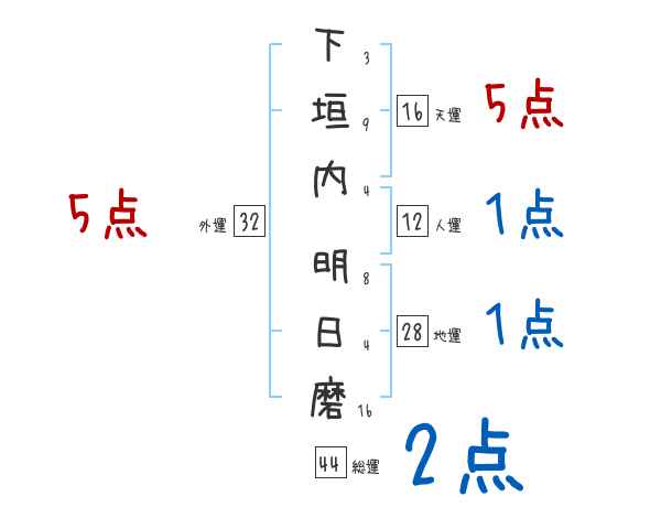 外運![]() | 下垣内明日磨さんの外運は32画の5つ星!柔軟性があり成功する。チャンスが多く金運が良い。 生活面を象徴する運勢です。外部から受ける影響力を表し、結婚運、家庭運や職場、環境への順応性を表します。 |