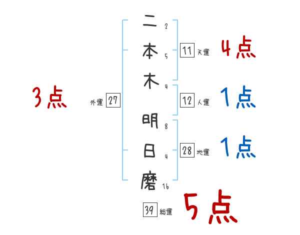 総運![]() | 二本木明日磨さんの総運は39画の5つ星!社交性に優れ人望が厚い。人の上に立ち成功する。 あなたの人生を表す1番重要な運勢です。生涯を通じて影響する総合運となり、主に50歳以降の晩年期に影響を及ぼします。 |
