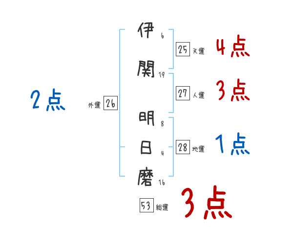 外運![]() | 伊関明日磨さんの外運は26画の2つ星!波瀾万丈かも。信頼できる人を大事にしましょう。 生活面を象徴する運勢です。外部から受ける影響力を表し、結婚運、家庭運や職場、環境への順応性を表します。 |
