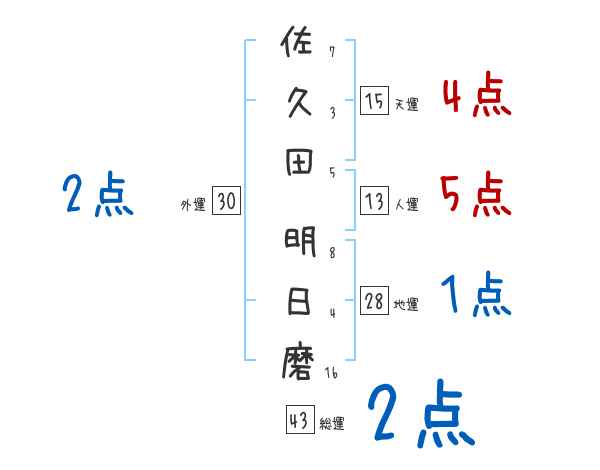 総運![]() | 佐久田明日磨さんの総運は43画の2つ星!頑固な性格で独立心が強いかも。やや非現実的で浪費に注意しましょう。 あなたの人生を表す1番重要な運勢です。生涯を通じて影響する総合運となり、主に50歳以降の晩年期に影響を及ぼします。 |