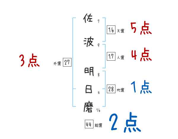 総運![]() | 佐波明日磨さんの総運は44画の2つ星!誠実で慎重な性格。物事を考えすぎないように注意しましょう。 あなたの人生を表す1番重要な運勢です。生涯を通じて影響する総合運となり、主に50歳以降の晩年期に影響を及ぼします。 |