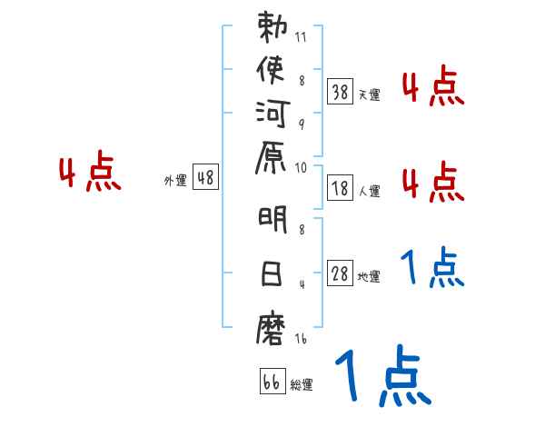 外運![]() | 勅使河原明日磨さんの外運は48画の4つ星!賢明な性格で人望が厚い。指導力があり多くの人に尊敬される。 生活面を象徴する運勢です。外部から受ける影響力を表し、結婚運、家庭運や職場、環境への順応性を表します。 |