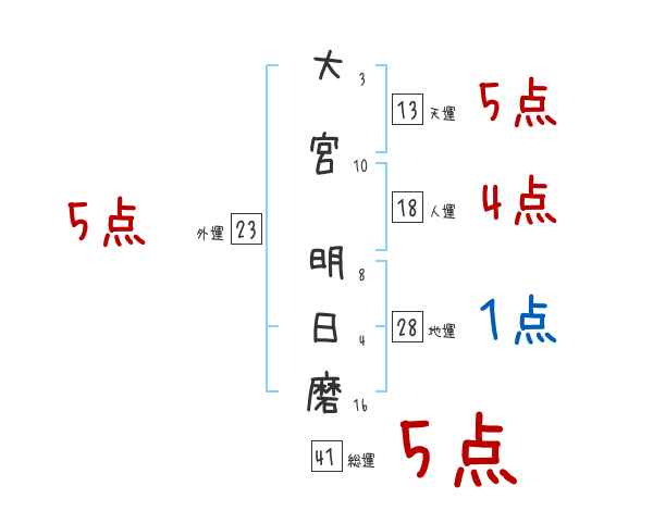 天運![]() | 大宮明日磨さんの天運は13画の5つ星!才能に恵まれ人気がある。名声を手に入れる。円満な人生。 家系が持つ宿命的な運勢を表します。祖先から受け継いだ苗字ですので自分の力が及びません。家柄を象徴します。 |