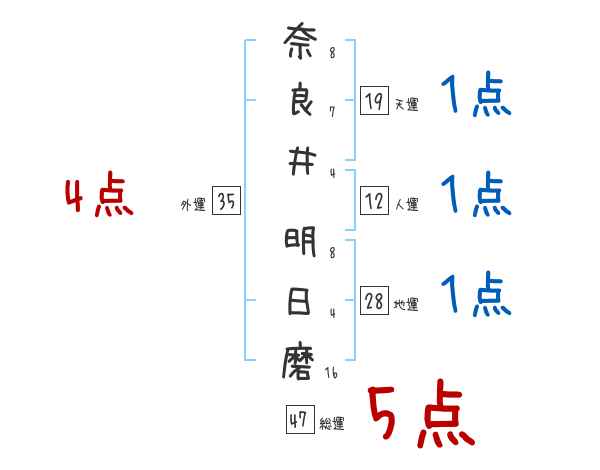 総運![]() | 奈良井明日磨さんの総運は47画の5つ星!実力が開花し発展する円満な人生。財に恵まれる。 あなたの人生を表す1番重要な運勢です。生涯を通じて影響する総合運となり、主に50歳以降の晩年期に影響を及ぼします。 |