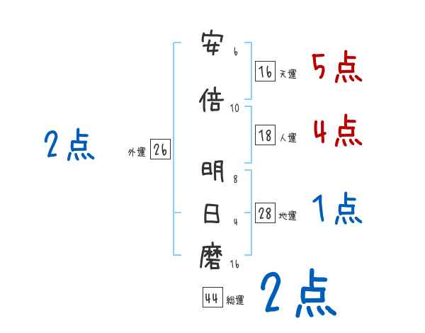 天運![]() | 安倍明日磨さんの天運は16画の5つ星!人望が厚く大きく発展する。逆転成功が見える。 家系が持つ宿命的な運勢を表します。祖先から受け継いだ苗字ですので自分の力が及びません。家柄を象徴します。 |