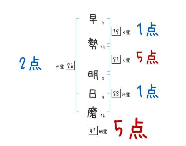 地運![]() | 早勢明日磨さんの地運は28画の1つ星!家庭環境に注意。スポーツで活躍できる能力があるかも。 個性を表す基礎的な運勢です。性格形成や対人関係、行動力など家庭環境に影響されます。主に誕生してから20歳くらいまでの若年期の運勢を表します。 |