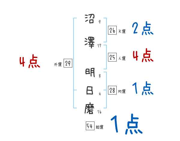外運![]() | 沼澤明日磨さんの外運は29画の4つ星!完全主義で才能がある。厳格な心の持ち主。 生活面を象徴する運勢です。外部から受ける影響力を表し、結婚運、家庭運や職場、環境への順応性を表します。 |