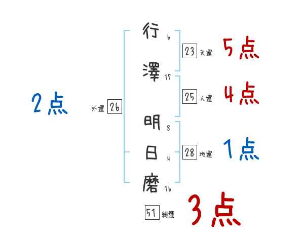 外運![]() | 行澤明日磨さんの外運は26画の2つ星!波瀾万丈かも。信頼できる人を大事にしましょう。 生活面を象徴する運勢です。外部から受ける影響力を表し、結婚運、家庭運や職場、環境への順応性を表します。 |