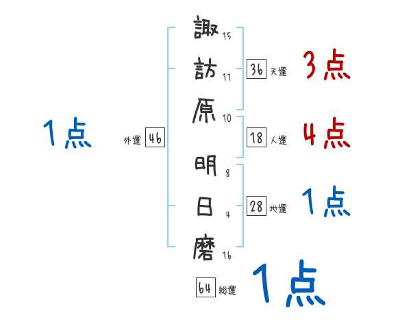 天運![]() | 諏訪原明日磨さんの天運は36画の3つ星!先見性が豊かです。多少神経質で苦労することも。 家系が持つ宿命的な運勢を表します。祖先から受け継いだ苗字ですので自分の力が及びません。家柄を象徴します。 |